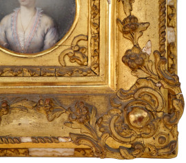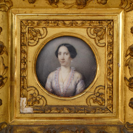 Miniatura raffigurante nobildonna, XIX secolo, tecnica mista su carta, cm 6,5x6,5 entro cornice, (difetti)