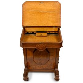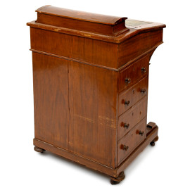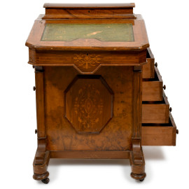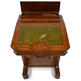 Mobile Davenport in noce intarsiato e filettato in varie essenze. Piano scrittoio foderato in cuoio verde apribile a ribalta e celante vano centrale con due piccoli vani alla parete di fondo, fiancheggianti un cassettino. Piccolo corpo superiore apribile e contenente vari vani. Ai fianchi quattro cassetti [..]