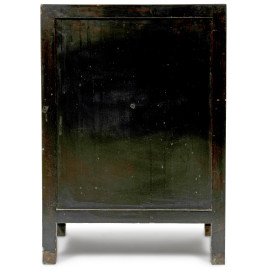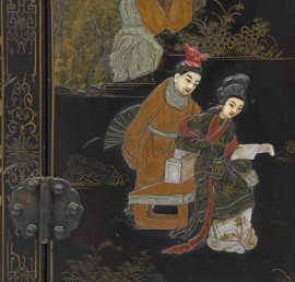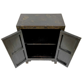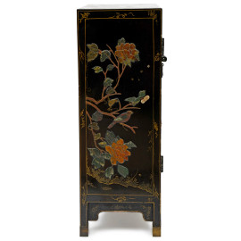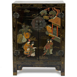 Mobile in legno laccato nero con fronte a doppio sportello e interno a doppio ripiano, decorato con motivi floreali e geometrici dorati. Al fronte scena di genere policroma a rilievo, cm 79x54x28. Giappone, XX secolo, (difetti)