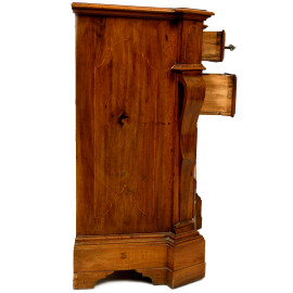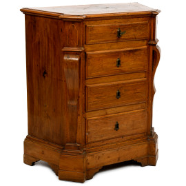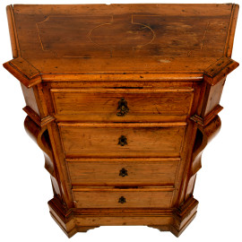 Mobiletto in noce con filettature in bosso, fronte scandito da quattro cassetti in colonna affiancati da lesene. Piano sagomato. XX secolo, cm 84,5x76x39,5, (difetti)