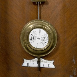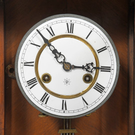 Orologio a pendolo da muro in legno con struttura architettonica arricchita da colonnine tornite, XX secolo, cm 68x40x19, (difetti, da revisionare)