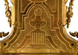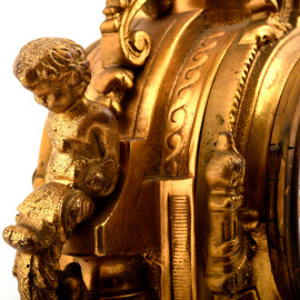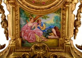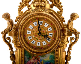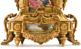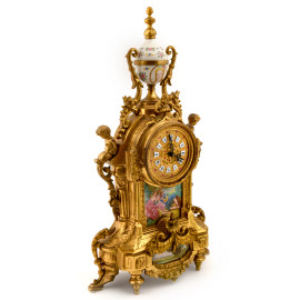 Orologio da camino in bronzo dorato con inserti in porcellana policroma, XX secolo, cm 48x27 (mancanze e meccanismo da revisionare) -
