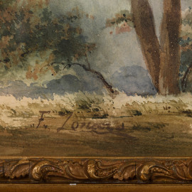 Paesaggio collinare, acquerello su carta applicata su cartone, cm 25,5x35, entro cornice, firmato in basso a sinistra