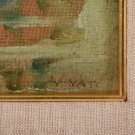 Paesaggio orientalista, olio su tela applicata su cartone, XX secolo, cm 22x14,5, entro cornice, (difetti)