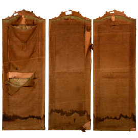 Paravento a 3 pannelli decorati a piccolo punto e sormontatida volute in legno intagliato, XX ssecolo, cm 118x40,5 cad., (difetti, rotture)