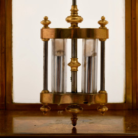 Pendola da tavolo con quadrante a smalto con numeri romani entro teca in vetro e metallo dorato, misura massima cm 30x17x13, XX secolo, (difetti, meccanismo da revisionare)