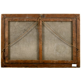 Pescatore e donne in paesaggio, olio su tela, fine del XIX inizi del XX secolo, cm 56,5x88 entro cornice, (difetti)