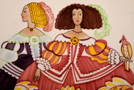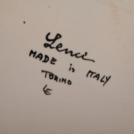 Piatto in ceramica Lenci decorato con rappresentazione di dame con pappagallo e levriero, XX secolo, diametro cm 41,5, (difetti)