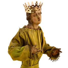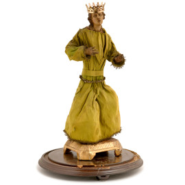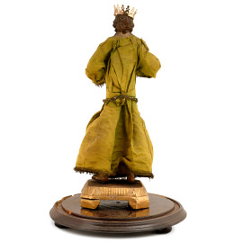 Regina Coelorum, XIX-XX secolo, scultura in legno policromo e stoffa, altezza cm 47 , entro campana in vetro con base lignea, altezza cm 61, (difetti, mancanze, rotture)