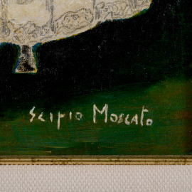 Scipio Moscato (XX), Dama con fiore, tecnica mista su tela, cm 89,5x19,5 entro cornice,(difetti)