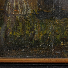 Scorcio di paesaggio con mucca, olio su tela applicata su cartone, cm 52x38,5, entro cornice, (difetti)
