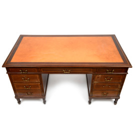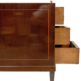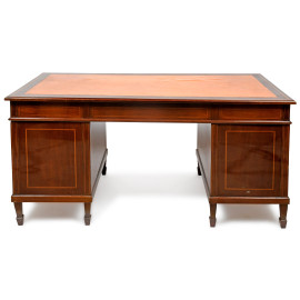Scrivania in noce e filettature in bosso con piano a tre cassetti al fronte e due piani estraibili lateralmente. Piano poggiante su due basi icon tre cassetti in colonna ciascuno, XX secolo, cm 75,5x149,5x79,5, (difetti)
