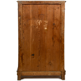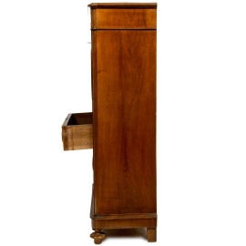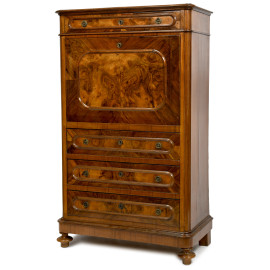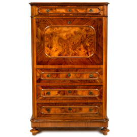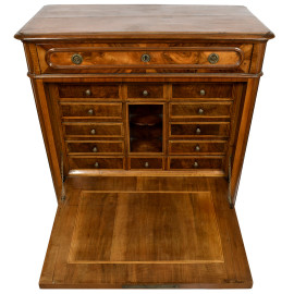 Fronte scandito da un cassetto superiore tre cassetti inferiori sormontati da calatoio apribile che cela banco scrittoio, 12 cassettini e 1 un vano centrale bipartito.