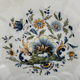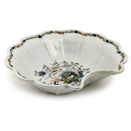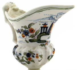 Servizio da barbiere composto da ciotola e versatoio in ceramica smaltata con ornato a paese e fiori, XIX secolo, misure massime cm 20x32x30, (difetti)