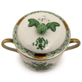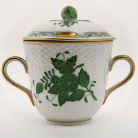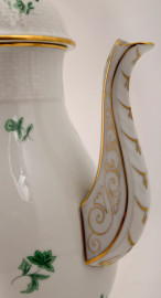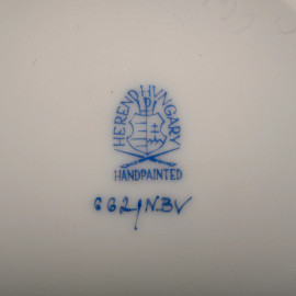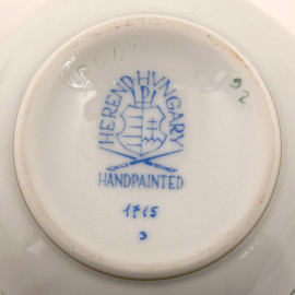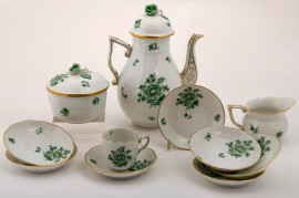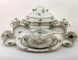 Composto da: 24 piatti piani, 12 piatti fondi, 12 piatti da frutta, 12 tazze da brodo con coperchio, 3 vassoi ovali da portata, 1 legumiera con coperchio, 1 zuppiera a doppia presa con coperchio, 1 insalatiera, 2 fiamminghe da portata a guisa di foglia; 1 salsiera con mestolo, 2 piatti circolari da portata, 12 tazzine da caffè e 12 piattini, 12 piattini da dolce. Completano il lotto una zuccheriera, una lattiera, una caffettiera, 7 piattini, 1 tazzina da caffè con orlo mosso in porcellana Herend non pertinente al servizio Happonyi