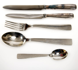 Composto da: 24 forchette; 1 mestolo; 12 forchettine da dolce, 12 cucchiaini, 12 cucchiai, 12 coltelli, 12 coltelli da dolce