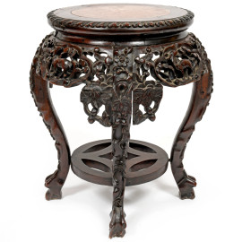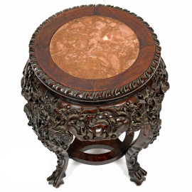 Sgabello in tek intagliato a motivi vegetali e animali con centro della seduta circolare in marmo, XX secolo, altezza cm 45, (difetti)