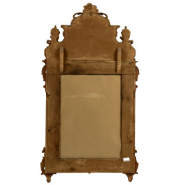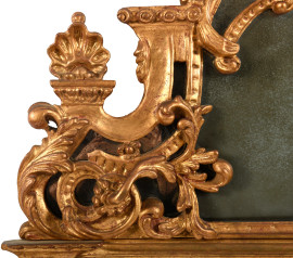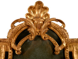 Specchiera con cornice in legno dorato e intagliato a volute fogliacee ed elemento apicale a conchiglia, specchio centrale racchiuso da cornice e sormontato da cimasa specchiate, XX secolo, cm 172x100, (difetti, specchio centrale non pertinente)
