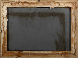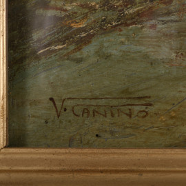 Strada con carrozza e vulcano in eruzione sullo sfondo, olio su compensato, firmato in basso a sinistra, cm 50,5x33,5, entro cornice, (difetti)