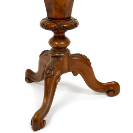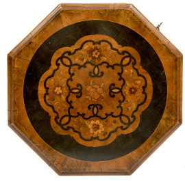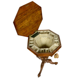 Tavolinetto da centro di forma ottagonale impreziosito da ricco intarsio centrale decorato con motivo floreale e volute stilizzate, apribile a ribalta e celante vano conico e scomparti con rivestimento in tessuto. Fusto centrale tornito che si innesta su tre gambe terminanti a volute, XIX-XX, cm 76x51, [..]