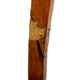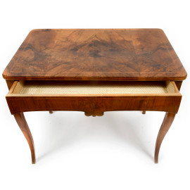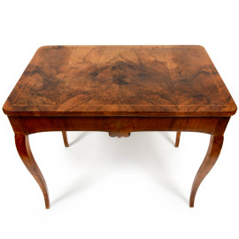 Tavolinetto in radica di noce con gambe mosse e intarsi in bosso sul piano, XIX secolo, cm 79x93x61, (difetti)