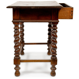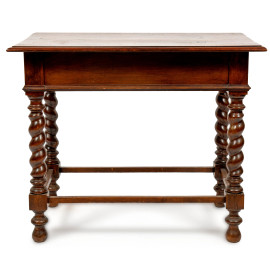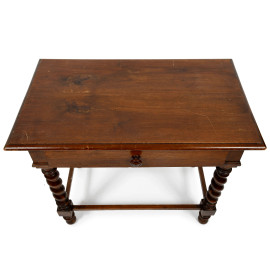 Tavolino in legno con cassetto al fronte e quattro gambe tornite raccordate, XX secolo, cm 65x79,5x47,5