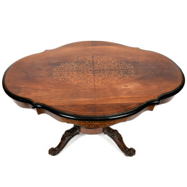 Tavolo con piano sagomato finemente intarsiato con decori fitomorfi in legni da frutto. Bordo profilato in legno laccato nero. XX secolo, cm 75x120x48, (difetti)