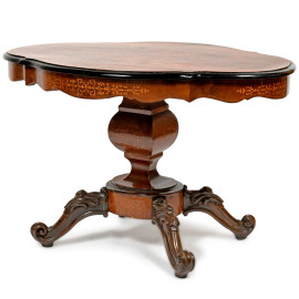 Struttura poggiante su base centrale tornita e scanalata, terminante in quattro gambe arcuate scolpite a volute fogliacee e piedini rocchettati