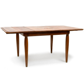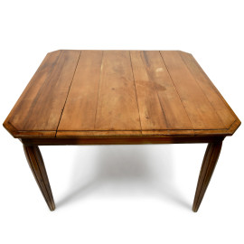 Tavolo in legno di noce con gambe scanalate con due prolunghe (cm 30 cad.), cm 73,5x98x109 (privo di prolunghe), XX secolo, (difetti)