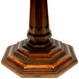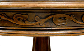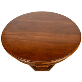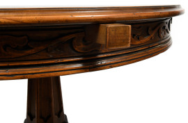 Tavolo tondo in noce intagliato con piano finemente intagliato al profilo, poggiante su gamba centrale scanalata e base ottagonale, cm 80x116, (difetti)