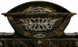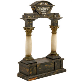 Tempietto per orologio in legno dipinto nero a finto marmo ed alabastro con decorazione arricchita da applciazioni in materiale cangiante, XX secolo, cm 59x36x15,5, (dfifetti)