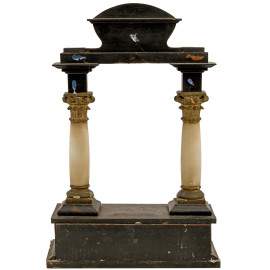 Impianto architettonico in stile con colonne liscie in alabastro poggianti su base modanata e architrave rettilineo sormontato da elemento a sarcofago decorato.