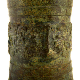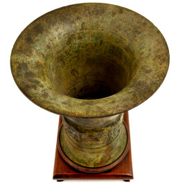 Vaso a tromba in bronzo su base in legno, cm 28x19,5, (difetti)