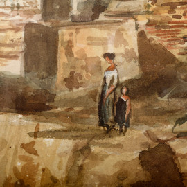 Veduta dell'Arco di Tito con figure, acquerello su carta, cm 30,5x55 entro cornice, firmato F. Pinci, (difetti)