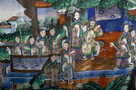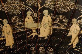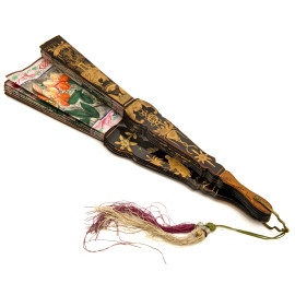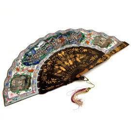 Ventaglio in carta dipinta, decoro raffigurante scene di volatili e figure orientali; al retro decorazione di ffiori con farfalle, cm 25x46,5, inizi del XX secolo, (difetti)