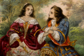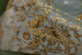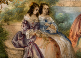 Ventaglio in carta dipinto con scene galanti entro teca, XIX secolo, cm 27x48,5, (difetti)