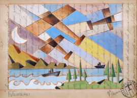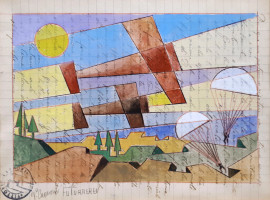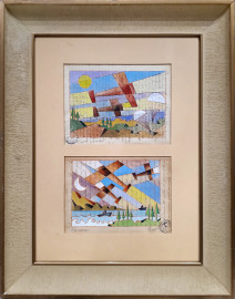 Vittorio Caproni (XX sec.) Futuraerei, lotto composto da due aeropitture a tecnica mista su foglio di carta a righe manoscritto, ciascuno cm 15x20, titolo firma e timbro dell’Artista