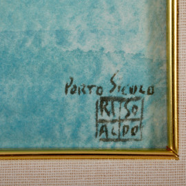 Aldo Riso (Santa Maria di Leuca, 1928 – Roma, 2008) , Porto siculo, acquerello su carta, titolato e firmato in basso a destra, cm 75x55 compreso passepartout entro cornice