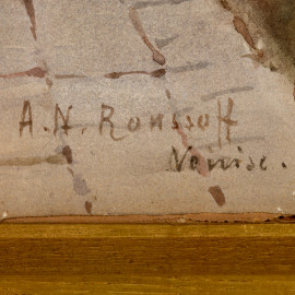 Alexandre Nicolaievitch Roussoff ( 1844-1928 )Scorcio di calle veneziano, acquerello su carta applicata su cartone, cm 61x26, firmato in basso a destra e iscritto "Venise", entro cornice
