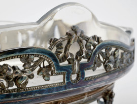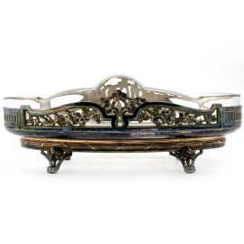 Alzata ovale con struttura in metallo cesellato a motivi floreale e vetro, poggiante su quatttro piedini a ricciolo, XX secolo, cm 12,5x32,5,20,5