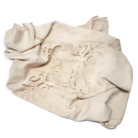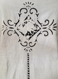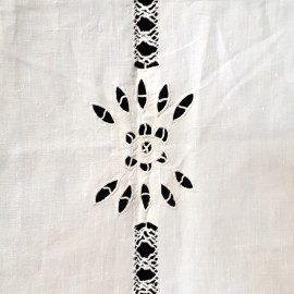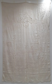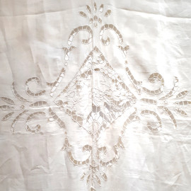 Antica tenda in lino finemente ricamata e traforata a mano, cm 235x140
