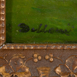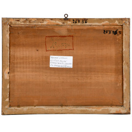 Barche al tramonto, XX secolo, olio su compensato, firmato in basso a destra, cm 25x36, entro cornice