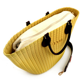 Borsa Obag gialla con manici e tracolla bordeaux, cm 27x54, (segni di usura)