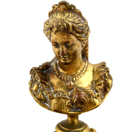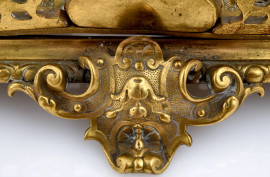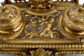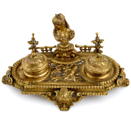 Calamaio in metallo dorato riccamente cesellato a volute e putto con elemento scultoreo centrale a guisa di figura femminile. XX secolo, cm 16x28x17, (usura del tempo)