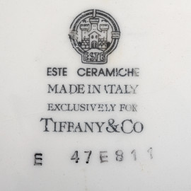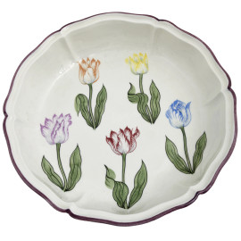 Centrotavola in porcellana Tiffany decorata con motivi di tulipani in vari colori, XX secolo, diametro cm 38,5, (difetti)