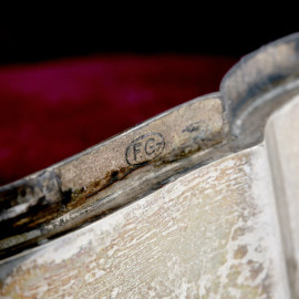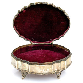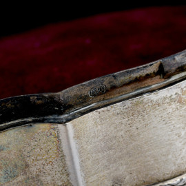 Cofanetto in argento dal profilo mistilineo poggiante su quattro piedini. Coperchio cesellato a motivi vegetali. Interno con imbottitura in velluto. Fondo in cartone. XX secolo, peso lordo gr 200, cm 5x13,5x10, (segni di usura, difetti)