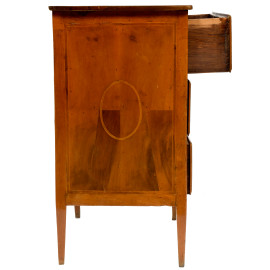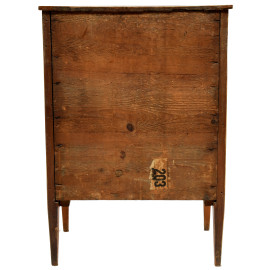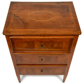 Comodino a tre cassetti in noce con filetti in bosso, XVIII-XIX secolo, cm 82,5x57,5x43, ( segni di usura)