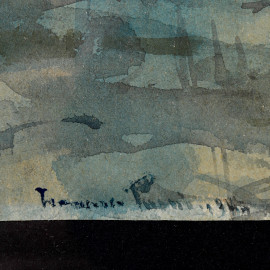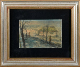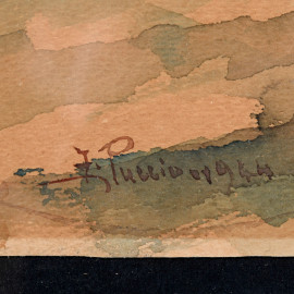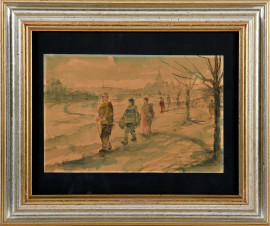 Coppia di acquerelli su carta raffiguranti figure nel paesaggio, XX secolo, firmati e datati 1944 in basso a sinistra, cm 23,5x28,5 compreso passepartout, entro cornice