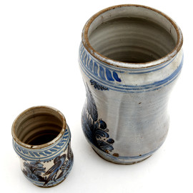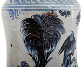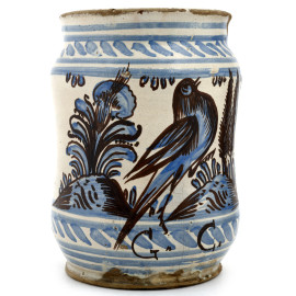 Coppia di albarelli in maiolica decorata con motivi di volatili, animali mitologici e girali vegetali, XIX - XX secolo, altezza massima cm 26,5 , (cadute di smalto stannifero, difetti di cottura, felature, restauri e rotture)
