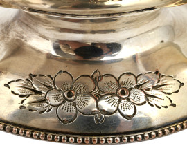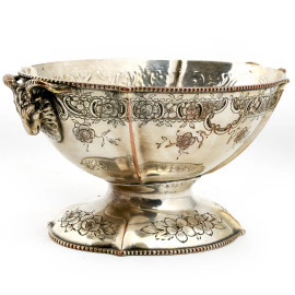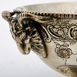 Coppia di alzatine in metallo argentato finemente lavorati a cesello con prese a foggia di ariete, cm 9x18,5x11